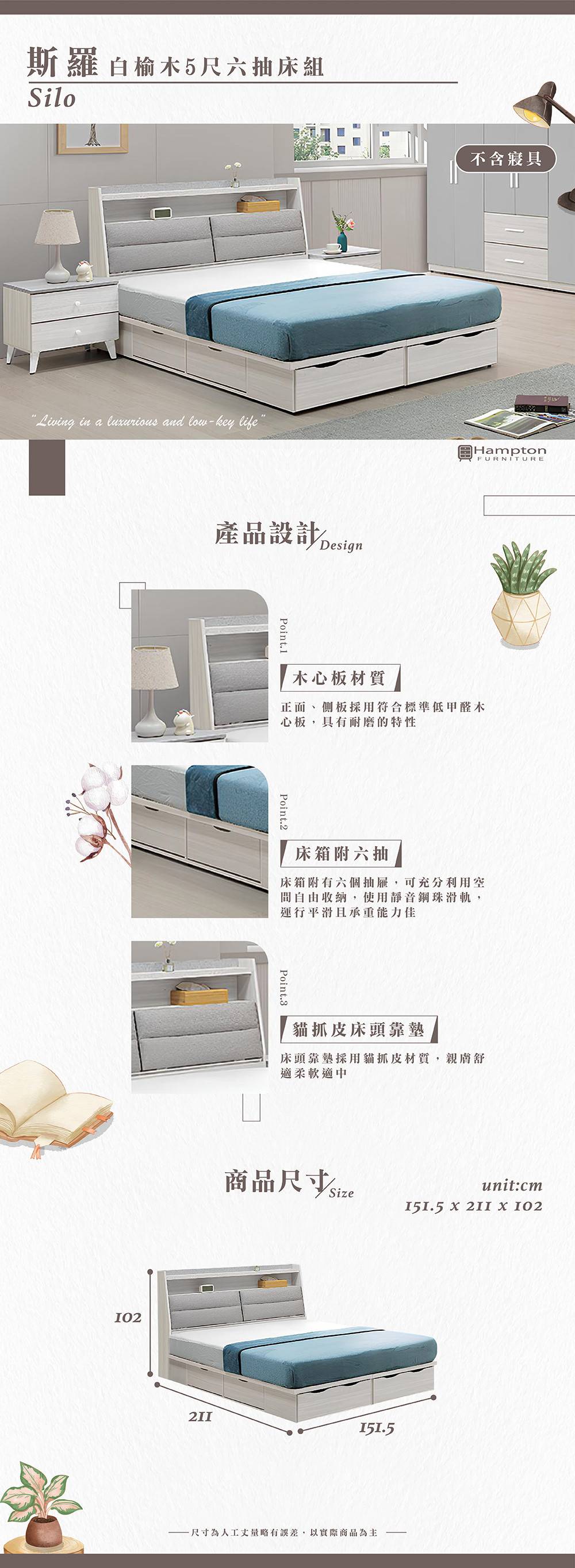 斯羅白榆木5尺六抽床組