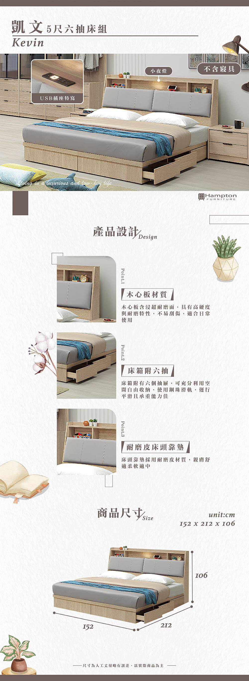| ● 商品特色 | 1.木心板材質 耐重耐壓 2.床箱附六抽 方便置物收納 3.附USB插座 方便充電使用 |