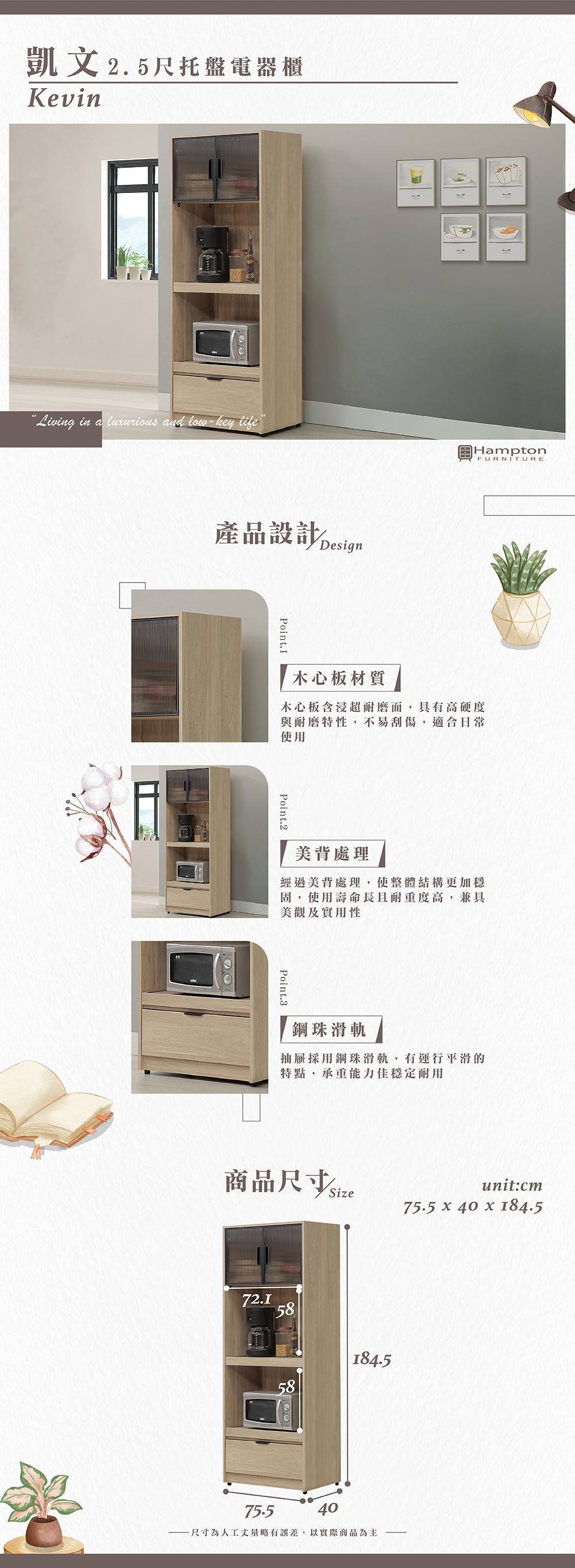 商品詳情 ● 商品特色 1.木心板材質 結構穩固使用安心 2.鋼珠滑軌 運行平滑 3.美背處理 ● 商品尺寸 75.5 x 40 x 184.5 cm (細節尺寸請參照文案) ● 配送方式 約配送貨 ● 組裝方式 需組裝,商品部分已一體成形需請客人確認行經搬運路徑是否可通行,若有搬不上去的情況發生,若要退貨需加收退貨運費 凱文2.5尺托盤電器櫃 TWD $8,672 TWD$ 7,490