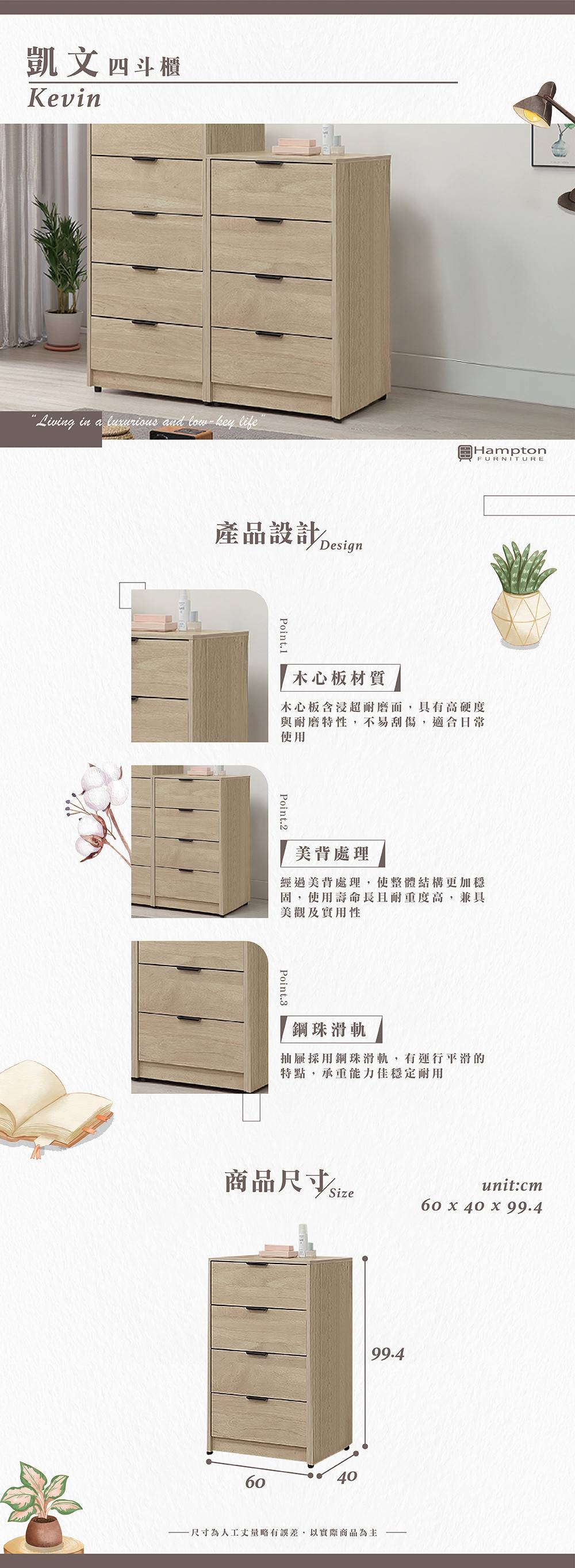 商品詳情 ● 商品特色 1.木心板材質 結構穩固使用安心 2.鋼珠滑軌 運行平滑 3.美背處理 ● 商品尺寸 60 x 40 x 99.4 cm (細節尺寸請參照文案) ● 配送方式 約配送貨 ● 組裝方式 需組裝,商品部分已一體成形需請客人確認行經搬運路徑是否可通行,若有搬不上去的情況發生,若要退貨需加收退貨運費 凱文四斗櫃 TWD $6,185 TWD$ 5,390