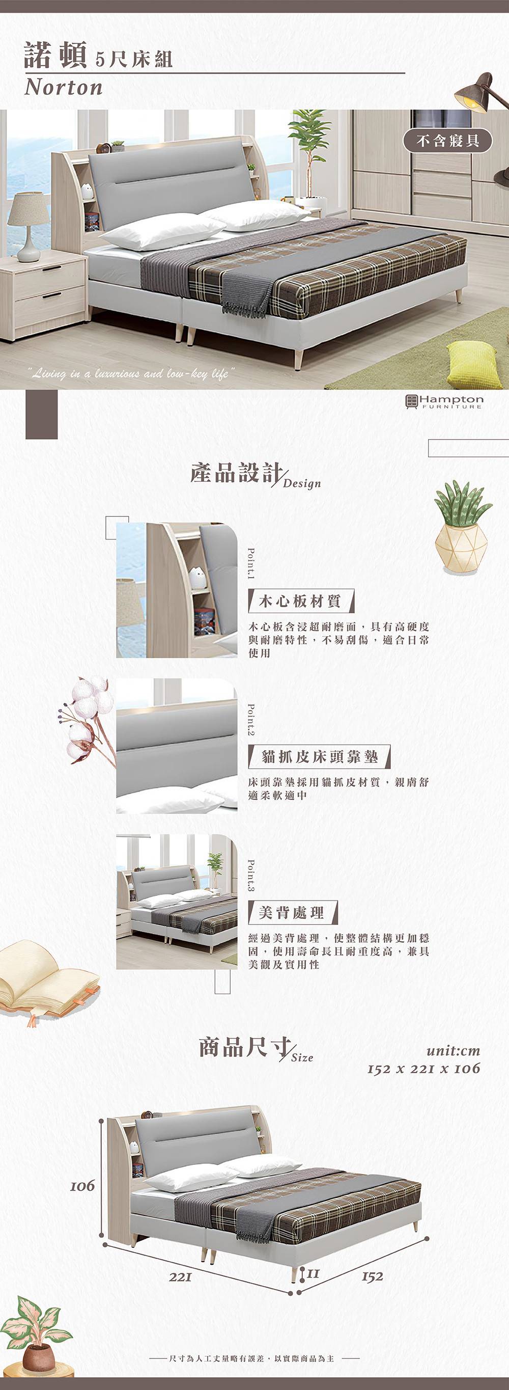 商品詳情 ● 商品特色 1.木心板材質 耐重耐壓 2.貓抓皮靠枕 親膚舒適 3.美背處理 ● 商品尺寸 152 × 221 x 106 cm (細節尺寸請參照文案) ● 配送方式 約配送貨 ● 組裝方式 需組裝,商品部分已一體成形需請客人確認行經搬運路徑是否可通行,若有搬不上去的情況發生 若要退貨需加收退貨運費 諾頓5尺床組 TWD $18,958 TWD$ 16,260