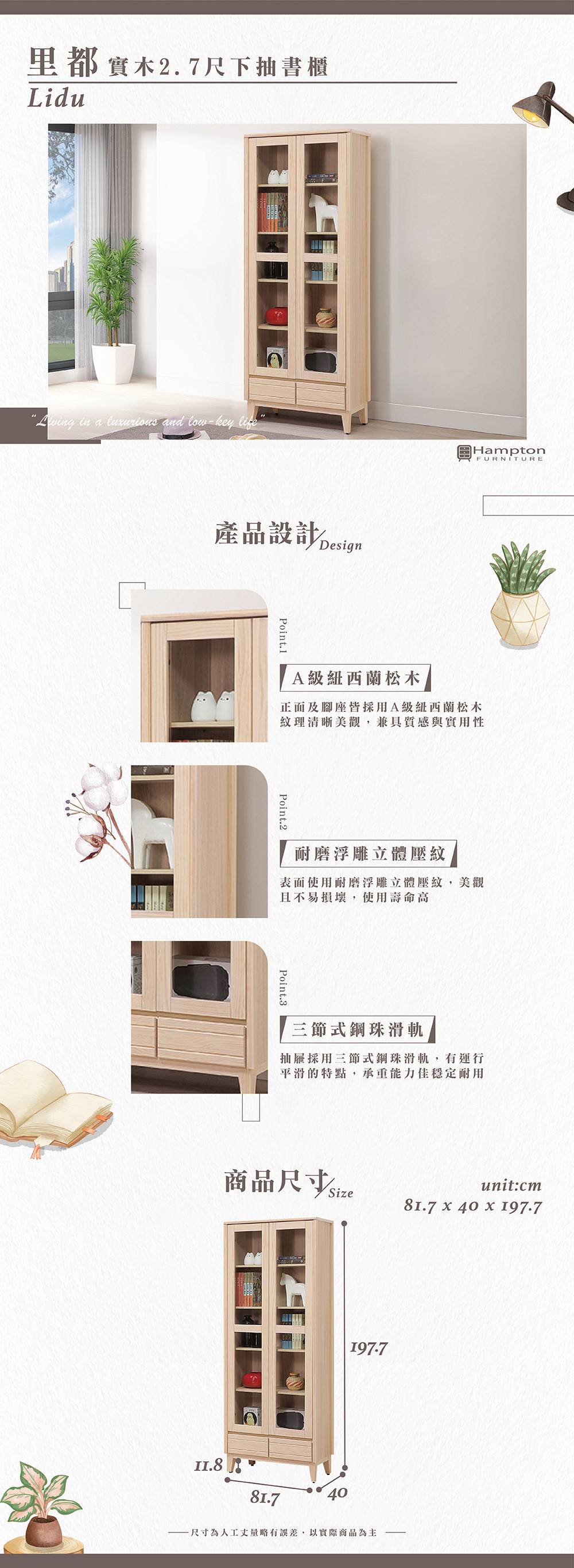 | ● 商品特色 | 1.A級紐西蘭松木 紋理清晰美觀 2.三節式鋼珠滑軌 運行平滑 3.門片五金採用油壓緩衝鉸鍊 |
