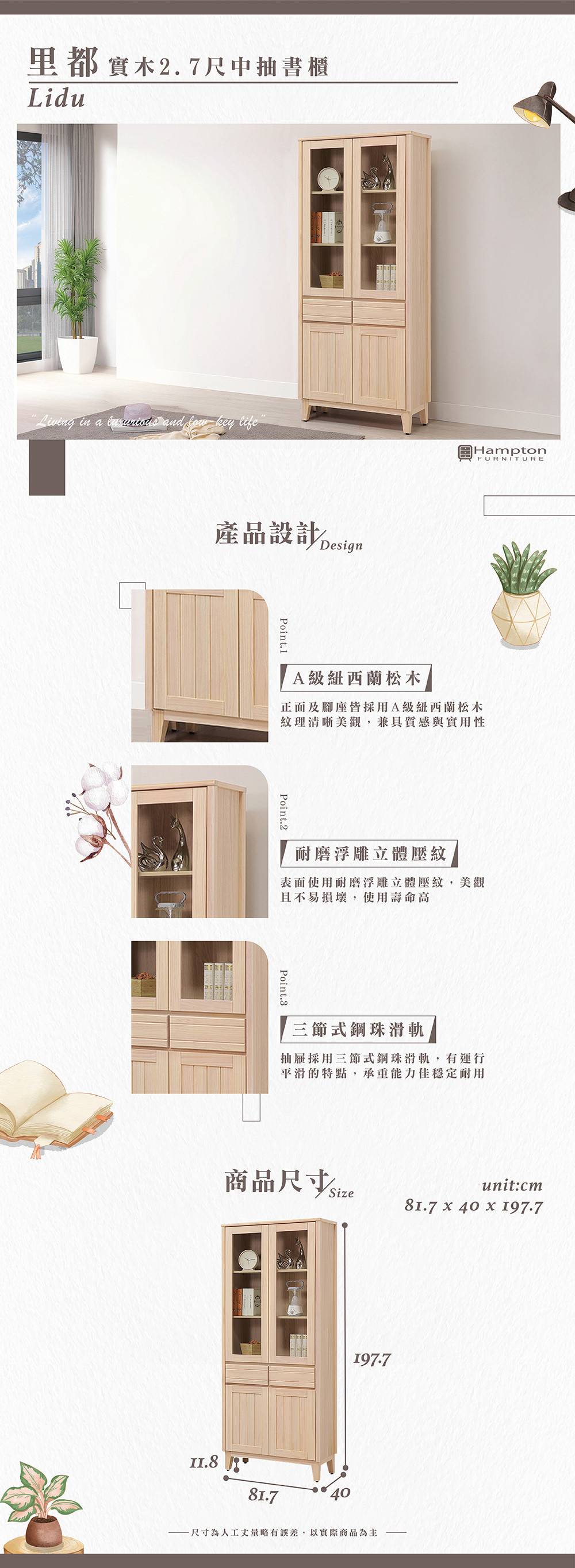 | ● 商品特色 | 1.A級紐西蘭松木 紋理清晰美觀 2.三節式鋼珠滑軌 運行平滑 3.門片五金採用油壓緩衝鉸鍊 |
