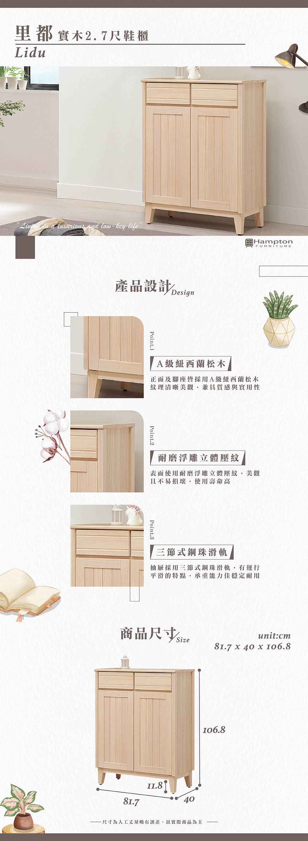 | ● 商品特色 | 1.A級紐西蘭松木 紋理清晰美觀 2.三節式鋼珠滑軌 運行平滑 3.門片五金採用油壓緩衝鉸鍊 |