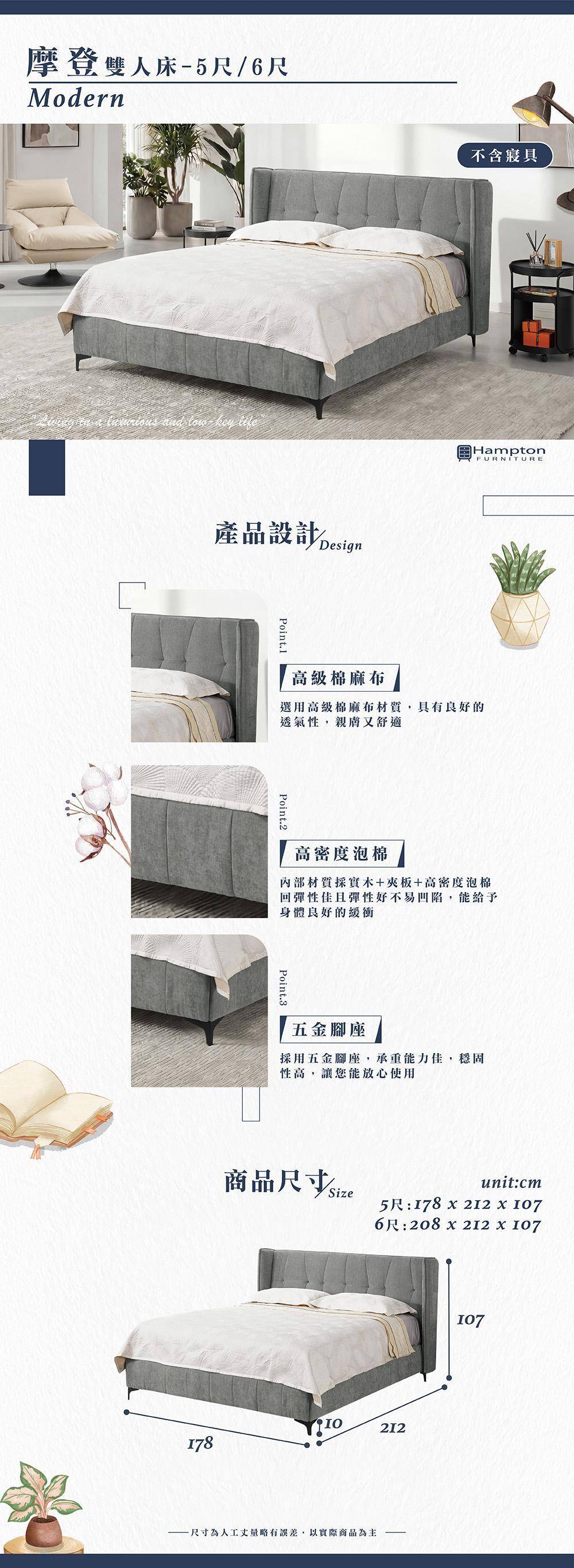 | ● 商品特色 | 1.高級棉麻布 親膚舒適 2.高密度泡棉 回彈性佳 3.五金腳座 穩固耐用 |
