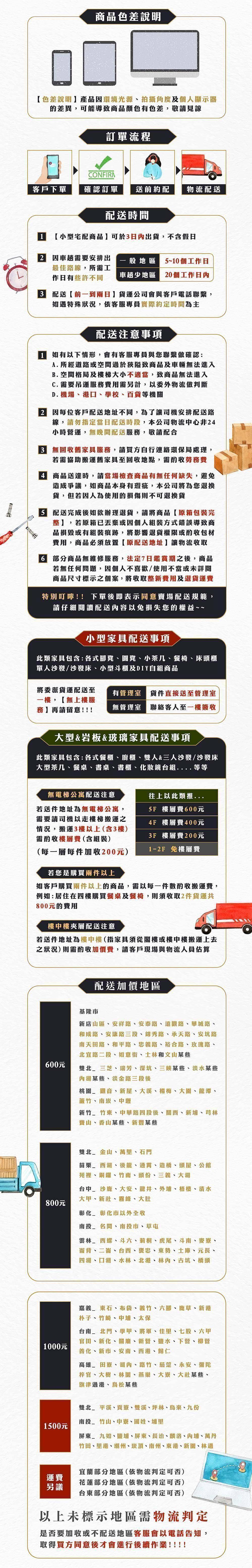 | ● 組裝方式 | 需組裝,商品部分已一體成形需請客人確認行經搬運路徑是否可通行,若有搬不上去的情況發生,若要退貨需加收退貨運費 |
