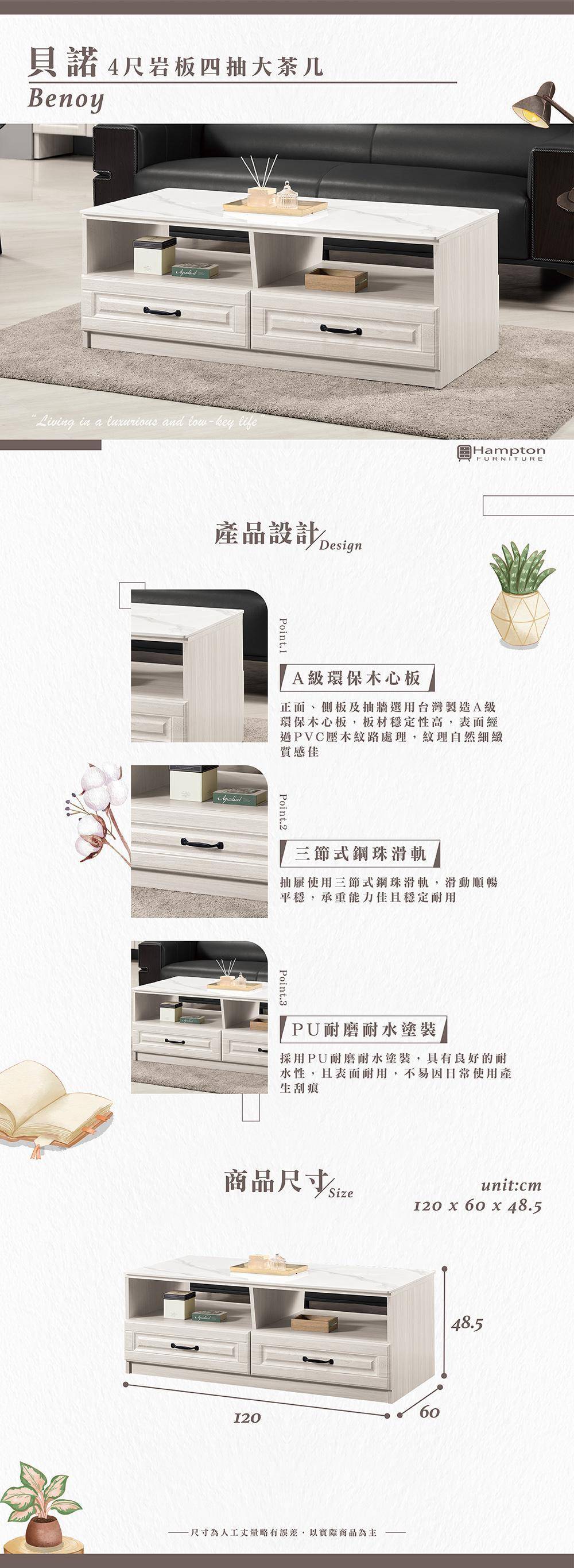 貝諾4尺岩板四抽大茶几