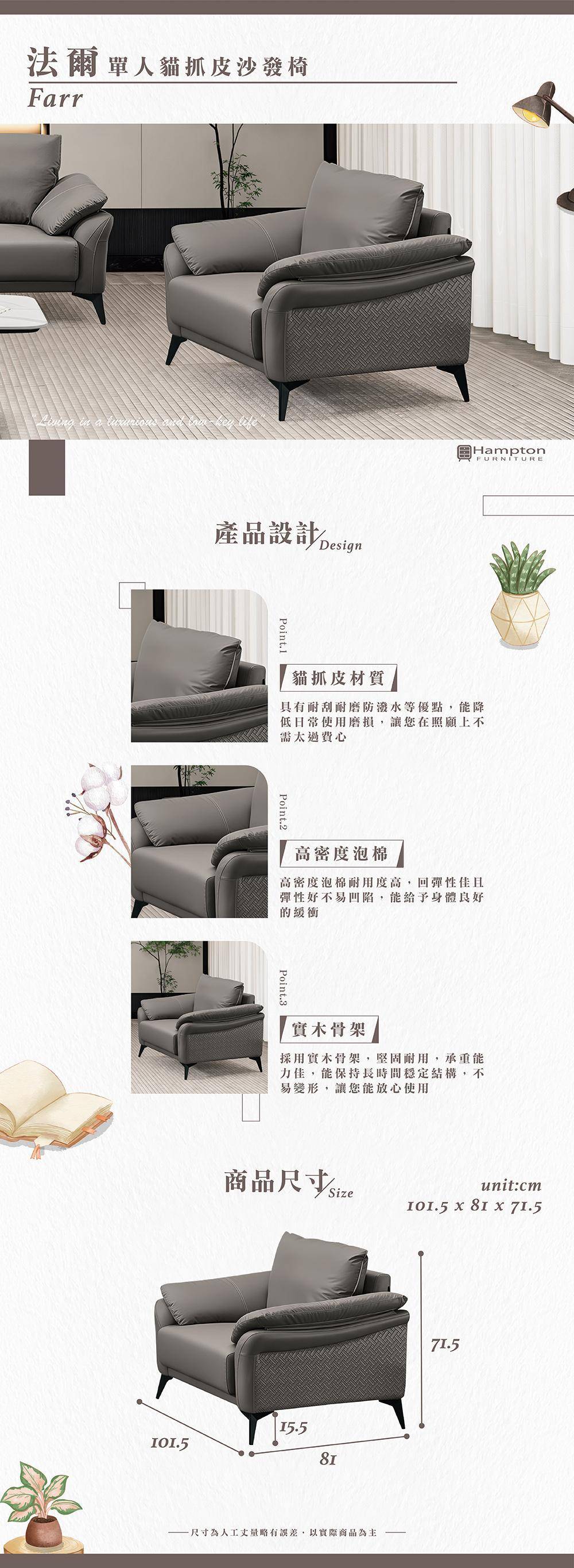 | ● 商品特色 | 1.貓抓皮材質 耐刮耐磨防潑水 2.高密度泡棉 彈性佳 3.實木骨架 堅固耐用 |