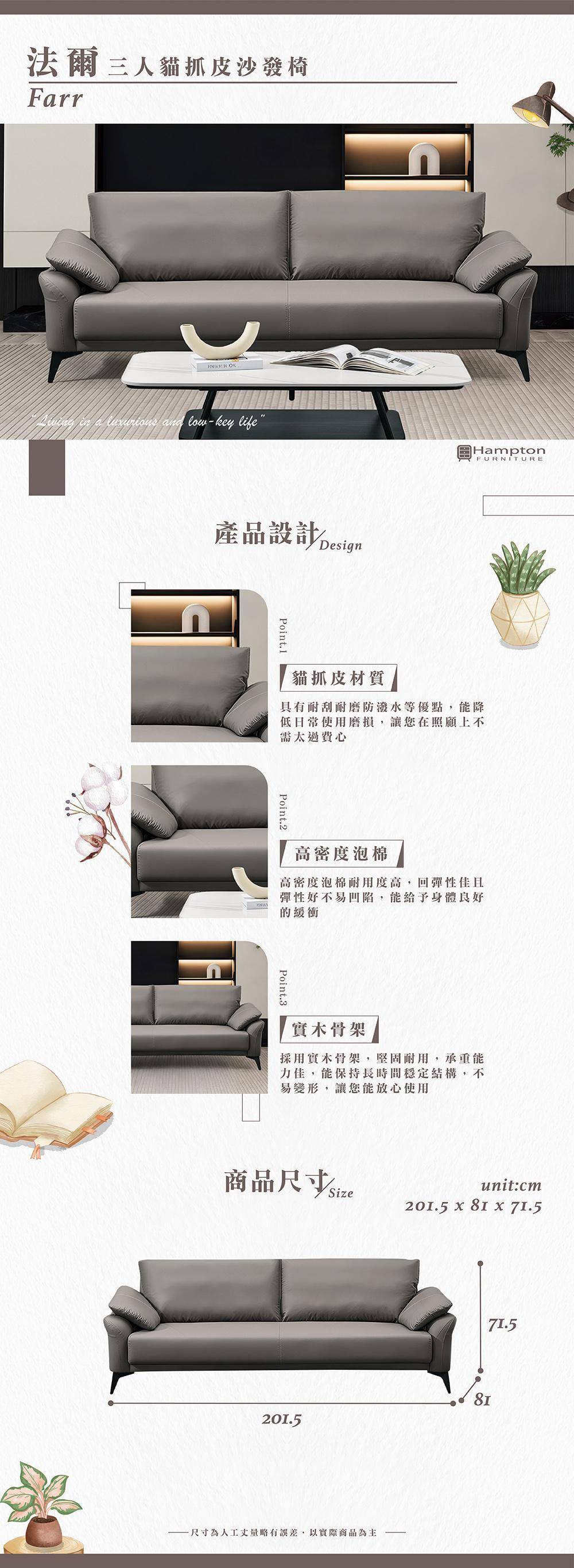 | ● 商品特色 | 1.貓抓皮材質 耐刮耐磨防潑水 2.高密度泡棉 彈性佳 3.實木骨架 堅固耐用 |