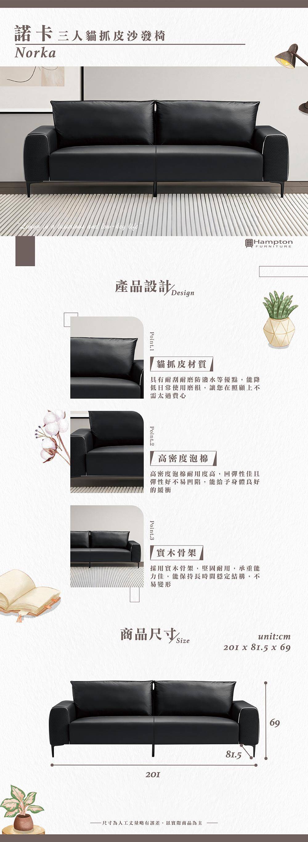 | ● 商品特色 | 1.貓抓皮材質 耐刮耐磨防潑水 2.高密度泡棉 彈性佳 3.實木骨架 堅固耐用 |